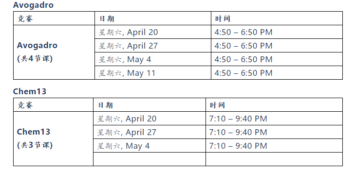 奥林匹克学校将会为 Avogadro 竞赛和 Chem13 竞赛开设冲刺班。如果学生感兴趣,请看下方课程安排时间: